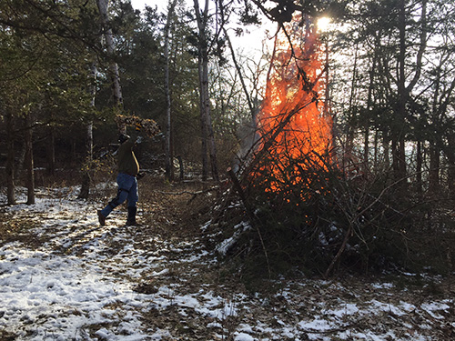 This winter, with completion of the current phase of restoration of the Welsh Hills prairies, attention has been turned to natural landscape restoration of Phoebe Point, a bluff high above the Wisconsin River opposite the Taliesin residence. Currently overgrown with invasive species such as red cedars and honeysuckle, Phoebe’s Point contains a quarry where stone was historically sourced for areas of Taliesin.