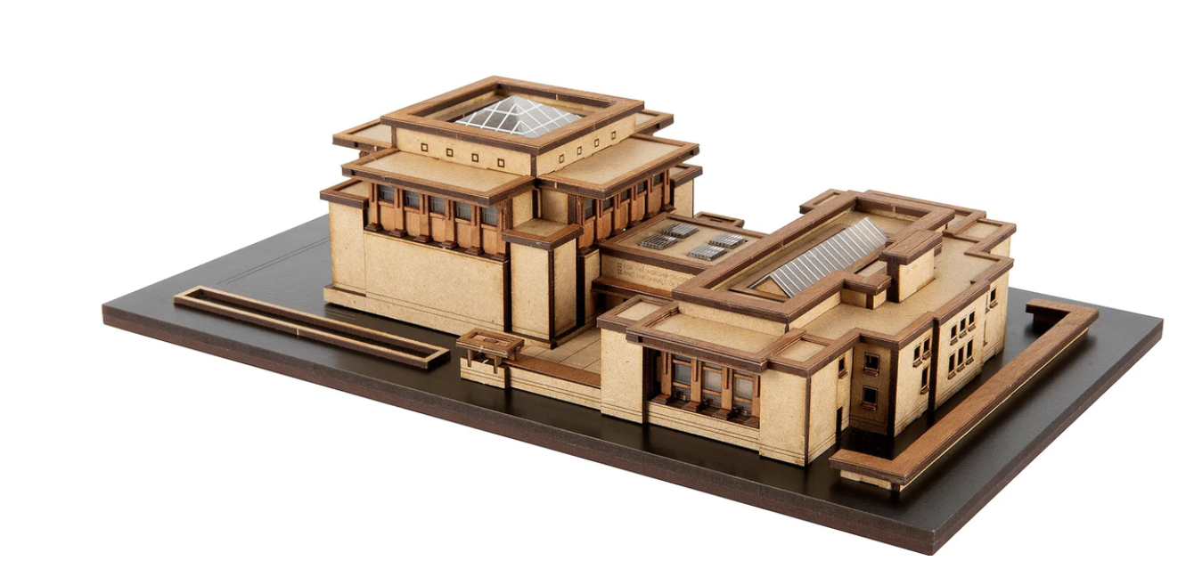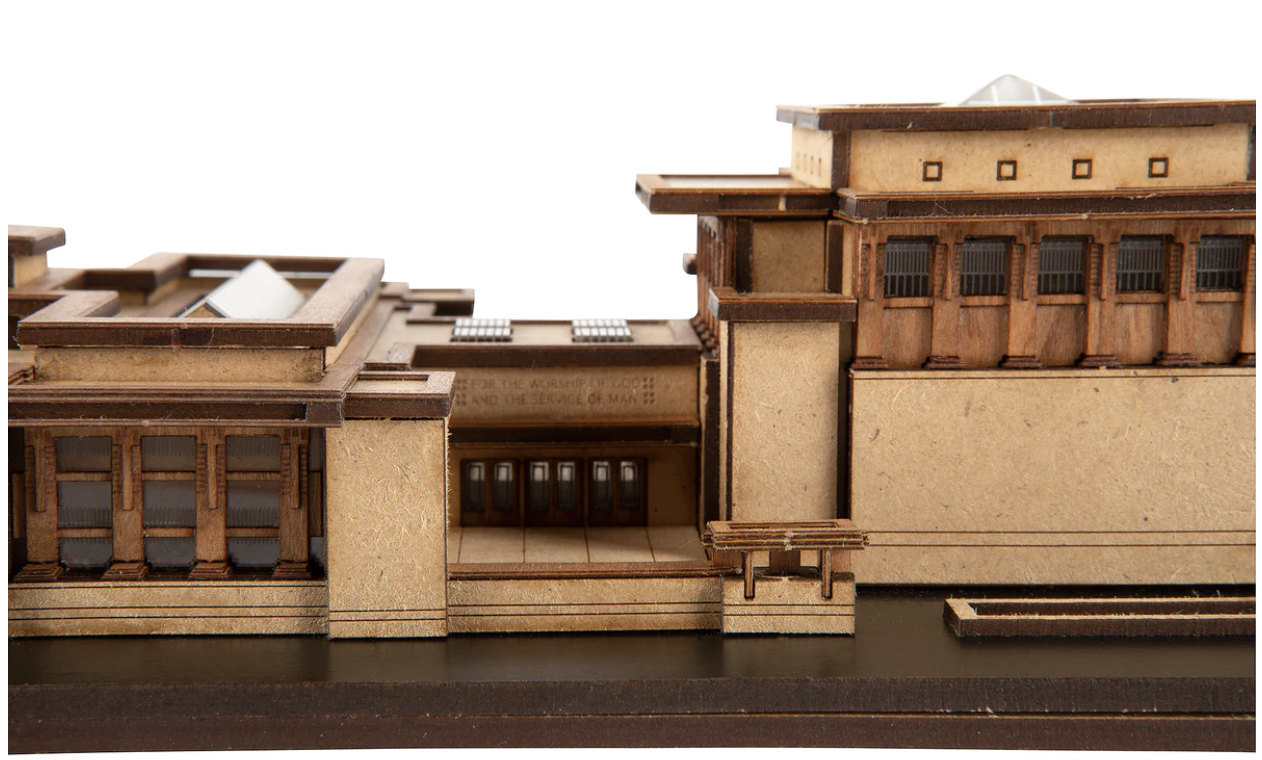 Product Description Constructed between 1905 and 1908, Unity Temple was one of the few public buildings that Wright designed in the Prairie Style. Meticulous details in the model accurately convey the temple’s compact but imposing volumes, from the flat roof and overhanging eaves that cloister the building to the extensive skylights that flood its interior with gentle light. The model uses American Cherry to highlight the design details of this unique building. The kit’s precise adherence to the architect’s design ensures your completed model is as stunningly beautiful and iconic as the original.