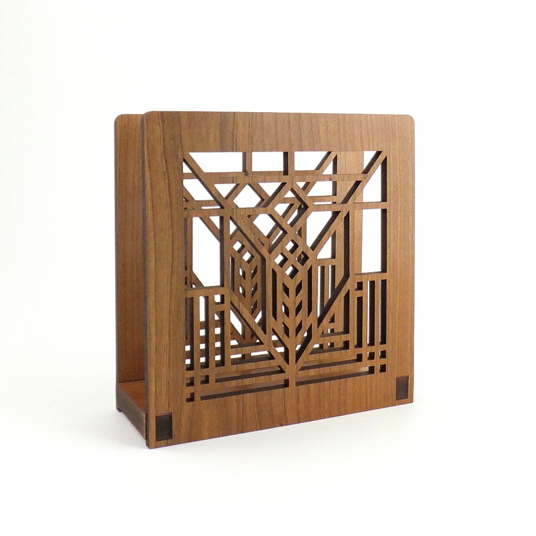 Perfect for holding dinner napkins or the day’s mail. The design of this laser-cut cherry wood holder is adapted from art glass windows originally found in the Lake Geneva Hotel (Lake Geneva, Wisconsin, 1911).