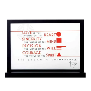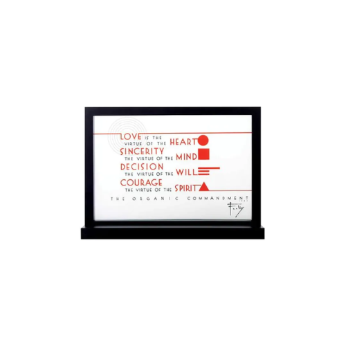 Product Description Frank Lloyd Wright's Organic Commandment is simple, yet graphically powerful and profound. First issued as a limited print run by Wright's Taliesin Press in 1934, the principles expressed assumed a broader application as a life philosophy and continue to have a significant impact on the fields of architecture and design. The source of the artwork adapted for this art glass panel is a Christmas card designed by Wright in 1948 for the Taliesin Fellowship and their friends. Weight: 1.20 lbs Includes wood stand.