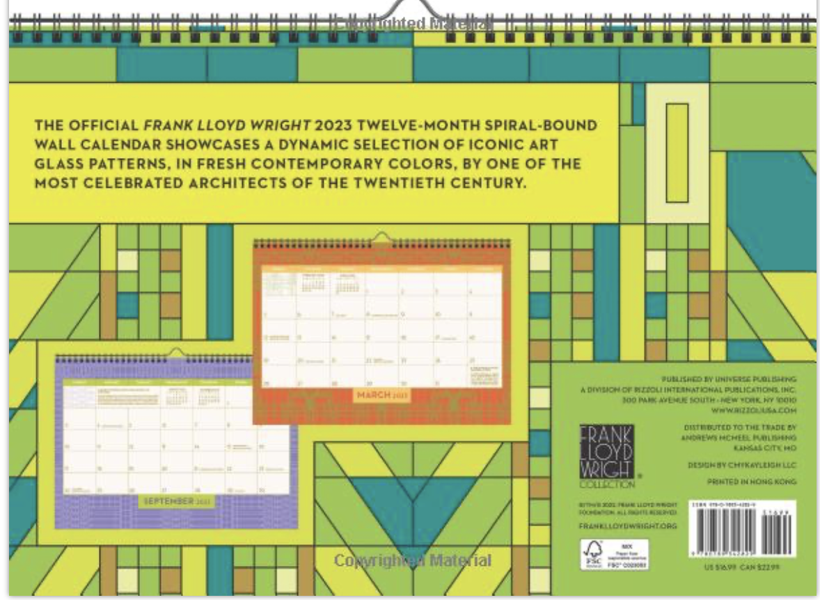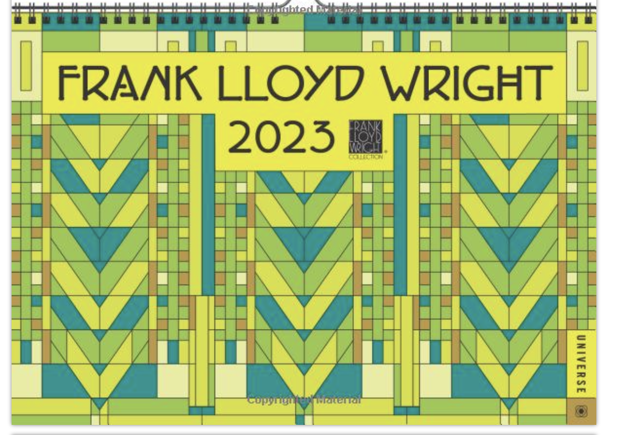 Product Description The official Frank Lloyd Wright 2023 Wall Calendar features stunning designs of iconic architect Frank Lloyd Wright, as curated by the esteemed Frank Lloyd Wright Foundation. Both aesthetic and practical, this wall calendar opens up to a generous 14" by 10" when displayed. Perfect for the architecture lover in your life as well as those who love beautiful art deco design, this calendar brings these stunning classic patterns to your home or office.