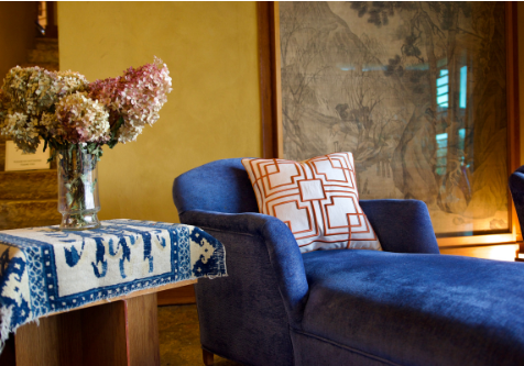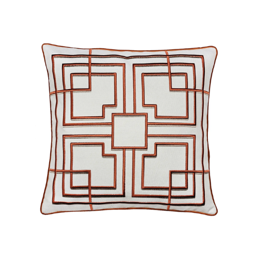 The Storer House pillow features Wright’s geometric cast concrete block design for the DS Storer House in Hollywood (1923), a plush rust velvet backing and detailed embroidery.