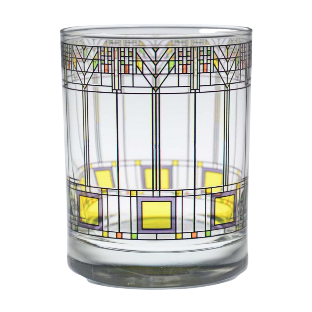 This set of two double old-fashioned glasses are inspired by Frank Lloyd Wright’s abstraction of the tree of life symbol using a square for the roots, straight lines for the trunk and chevrons for the branches.