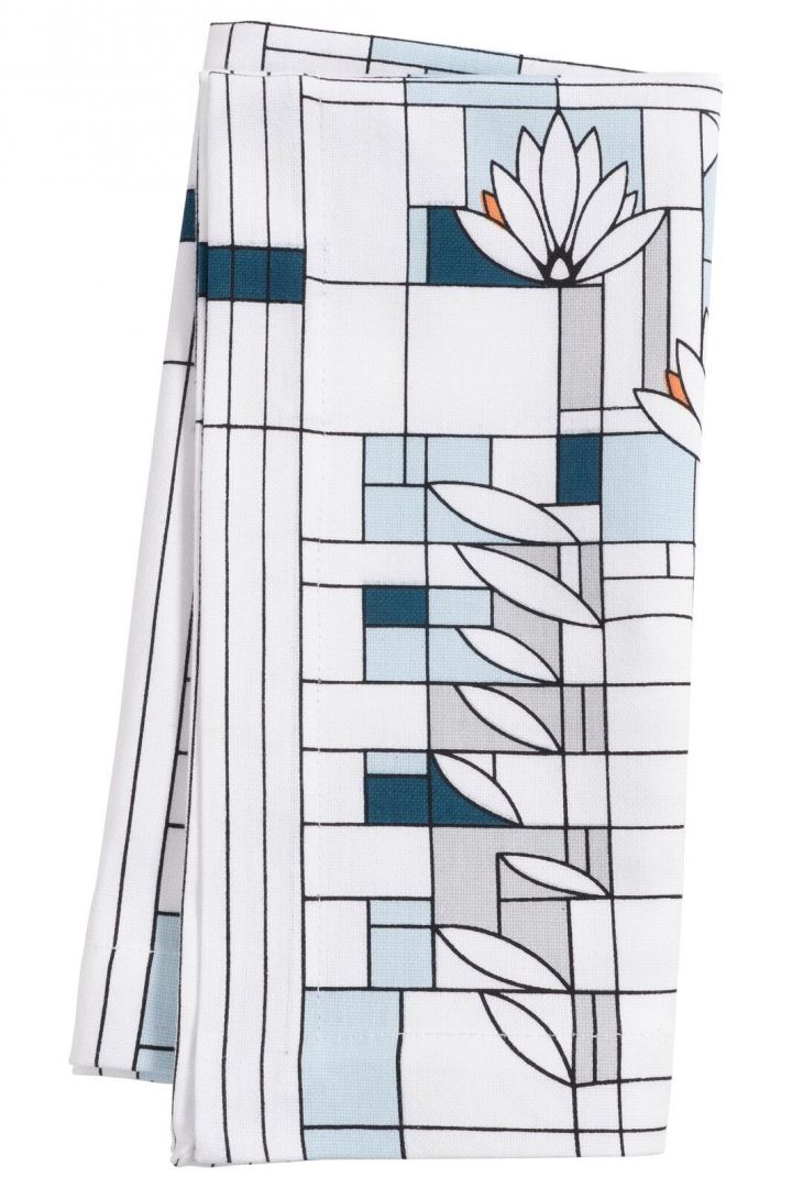 This 100% cotton napkin has a beautiful and elegant printed design inspired by the work of Frank Lloyd Wright. Soft to the touch and featuring mitered corners, this napkin will add elegance to any setting. ‘Waterlilies’ is an art glass window design that Wright never brought to life, but its graceful lines and tranquil composition makes it an iconic example of Wright’s organic architecture.