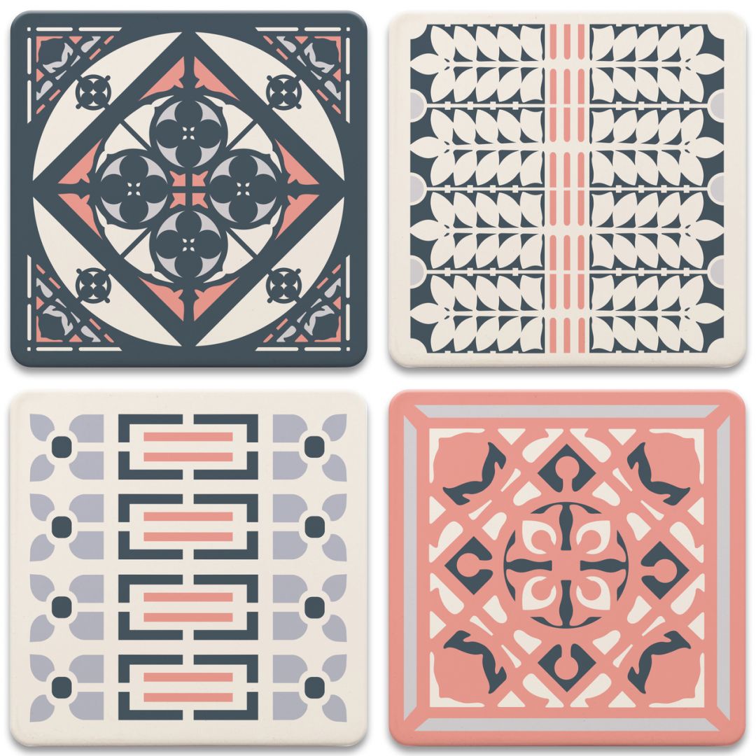 The designs on this coaster set are adapted from the details of the fretwork oak ceiling grille in the dining room from Wright’s Home & Studio (Oak Park, Illinois 1889). Overall geometric patterns representing oak branches and leaves are examples of his desire to bring natural elements into the living spaces of his homes.