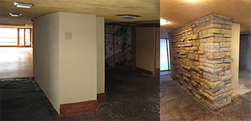 Plaster and wood framing installed after Frank Lloyd Wright’s death had concealed a stone wall underneath.The wall was restored this week as part of the Entry Foyer and Loggia Alcove Restoration project.