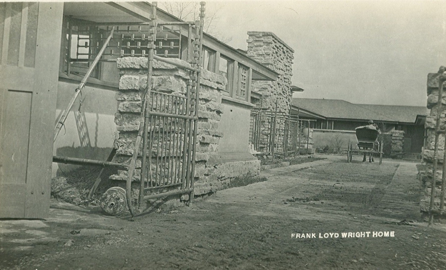 A postcard taken in Taliesin’s middle court in 1913-14 looking east toward its living quarters, with a carriage in the drive. A door to one of the bays at the carriage house, and the chimney at Wright’s studio, are on the left. Also the eyes don’t lie: The person who prepared the postcard spelled Frank Lloyd Wright’s name wrong (with one “L” instead of two). This image is also in Randolph Henning’s vintage postcards book Frank Lloyd Wright’s Taliesin.