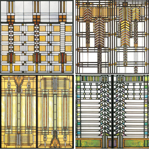 Throughout his career Wright created art glass designs for doors, skylights, back-lit ceiling panels, table lamps, and wall sconces as well as windows. Four of those designs are featured in this coaster set.