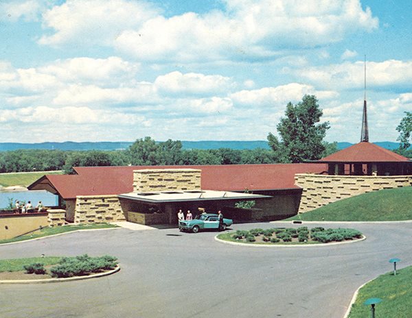 Designed by Wright as a part of the greater Taliesin campus, the Frank Lloyd Wright Visitor Center was once dubbed the “gateway to Taliesin.” Before it became a visitor center in 1994, the building housed a restaurant, offices, and meeting spaces for the architects at Taliesin. The building’s construction and design are attributed to Wright, Taliesin Associated Architects (TAA), and Kraemer Brothers. In 1967 the building opened as The Spring Green Restaurant as part of an investment in developing an arts community in Spring Green along the Wisconsin River. The building was innovative within the modernist movement of the late 1960s for its use of stone, concrete, stucco, asphalt, and glass. The Visitor Center has always been an integral part of Wright’s vision for Taliesin and therefore are proud of its Wisconsin historic recognition.