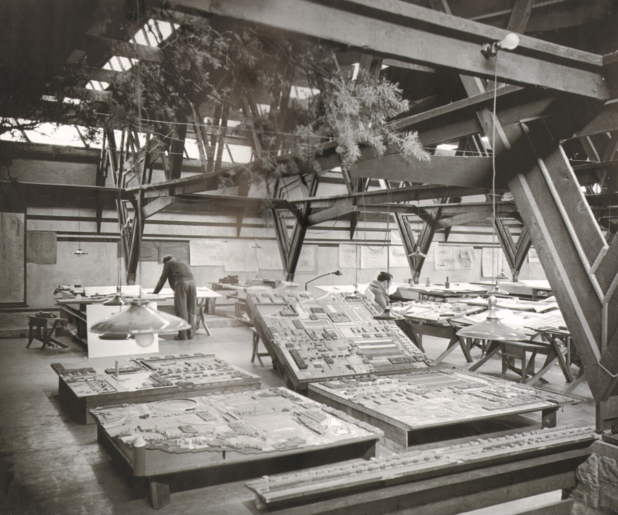 Two Taliesin Fellowship apprentices working on drawings in the Hillside Drafting Studio in Wisconsin. The large, 4-panel model in the foreground is of “Broadacre City,” Wright’s large concept for land and agrarian development (*It was never built). The number of drawings hanging on the wall depict Wright’s many commissions after World War II—and were also projects the Taliesin Fellowship apprentices worked on under his direction. Image owned by The Frank Lloyd Wright Foundation Archives (The Museum of Modern Art | Avery Architectural and Fine Arts Library, Columbia University, New York).